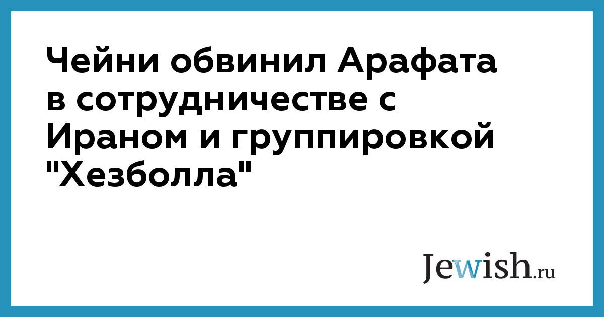 В начале месяца израильские ВМС перехватили в Красном море партию весом 50 тонн. "Мы не верим ему", — категорично заявил Чейни другой телекомпании — Эй-би-си. По его словам, "вызывает тревогу то, что есть много мест в арабском мире, куда Арафат мог бы обратиться, если бы он добивался поддержки или помощи в продвижении вперед мирного процесса". Арафат, однако, отметил вице-президент, "обратился к террористической организации "Хезболла" и государству, которое поддерживает терроризм и делает все, чтобы остановить мирный процесс".