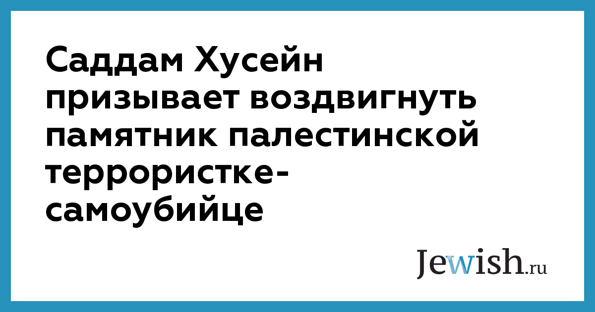 Президент Ирака Саддам Хусейн распорядился возвести в Багдаде памятник палестинской женщине, которая в минувшее воскресенье совершила самоубийственный теракт в Иерусалиме. Он сделал это заявление на встрече с учеными и художниками, состоявшейся в министерстве промышленности. По словам иракского лидера, "мученическая смерть — лучший подарок, который можно сделать своему народу". С.Хусейн уже второй раз за последнее время приказывает установить памятник погибшим в антиизраильской "интифаде" палестинцам. Несколько месяцев назад он призвал установить на одной из улиц Багдада статую в память о палестинском мальчике, который был убит перед телекамерами огнем израильских солдат.