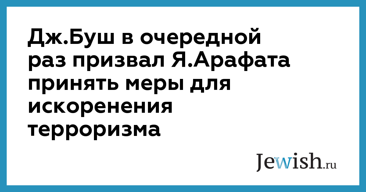 Президент США Джордж Буш вновь выступил с критикой позиции лидера палестинской автономии Ясира Арафата и в очередной раз призвал его принять меры для искоренения терроризма, — передает AFP. Приветствуя в Белом Доме короля Иордании Абдаллу II, Дж.Буш отметил, что "существуют мирный план (по урегулированию на Ближнем Востоке), но он начнет претворяться в жизнь, только при условии сосредоточения усилий всех участников конфликта. Господин Арафат должен лучше делать эту работу. Мы верим, что он сможет ее сделать, и что он должен ее делать", подчеркнул Дж.Буш. В тоже время глава Белого дома ни как не прокомментировал заявление Ариэля Шарона, который выразил сожаление о том, что "не убил Я.Арафата в Бейруте в 1982г."