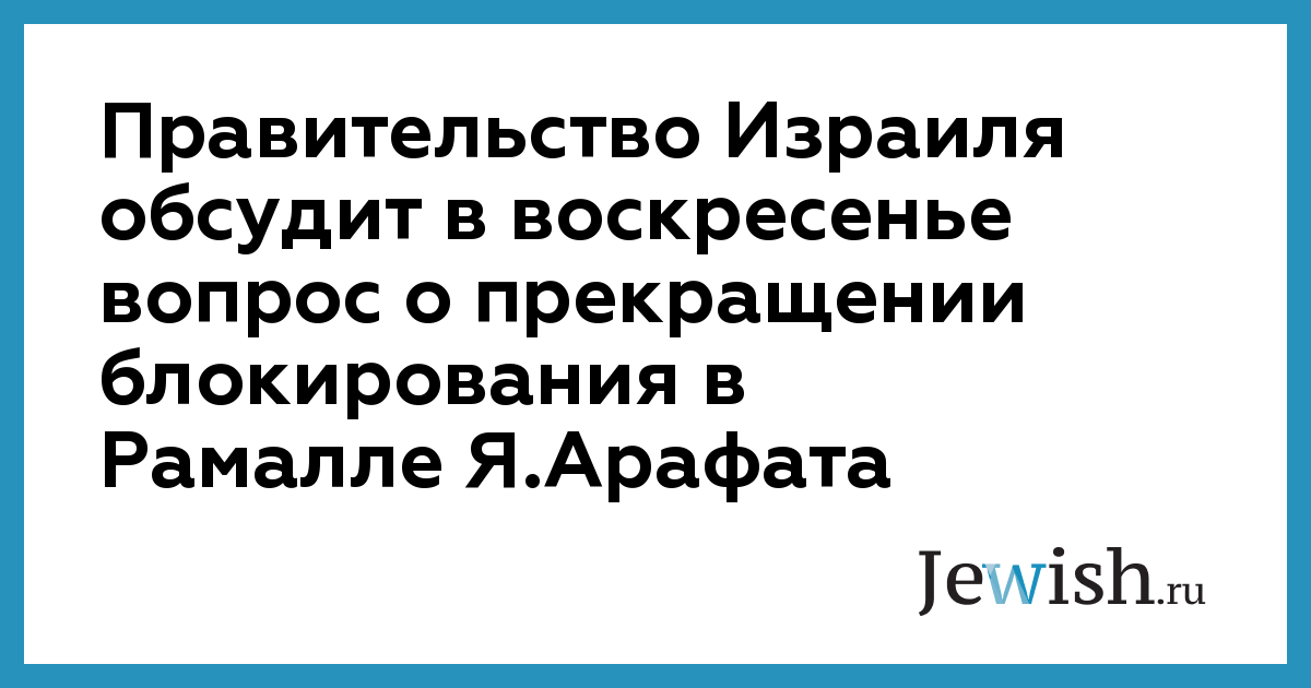 Правительство Израиля обсудит в воскресенье, 24 февраля, вопрос о прекращении блокирования в городе Рамалла главы палестинской автономии Ясира Арафата. Министр обороны страны Биньямин Бен Элиезер и министр иностранных дел Шимон Перес выступают за снятие блокады, заявляя, что глава палестинской автономии выполнил требования Израиля. В частности, Я.Арафат распорядился арестовать убийц израильского министра туризма Рехавема Зеэви, а также — организаторов попытки контрабандного ввоза оружия на палестинские территории.