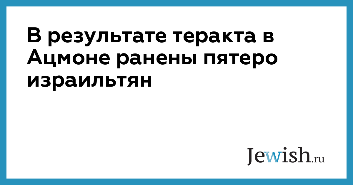 В результате теракта, совершенного вооруженным палестинцем в еврейском поселении Ацмона, ранены, по крайней мере, пятеро израильтян. По словам представителей армии Израиля, палестинцу удалось проникнуть в Ацмону, после чего он открыл огонь по прохожим. Израильские солдаты вступили в перестрелку с палестинцем и убили его.