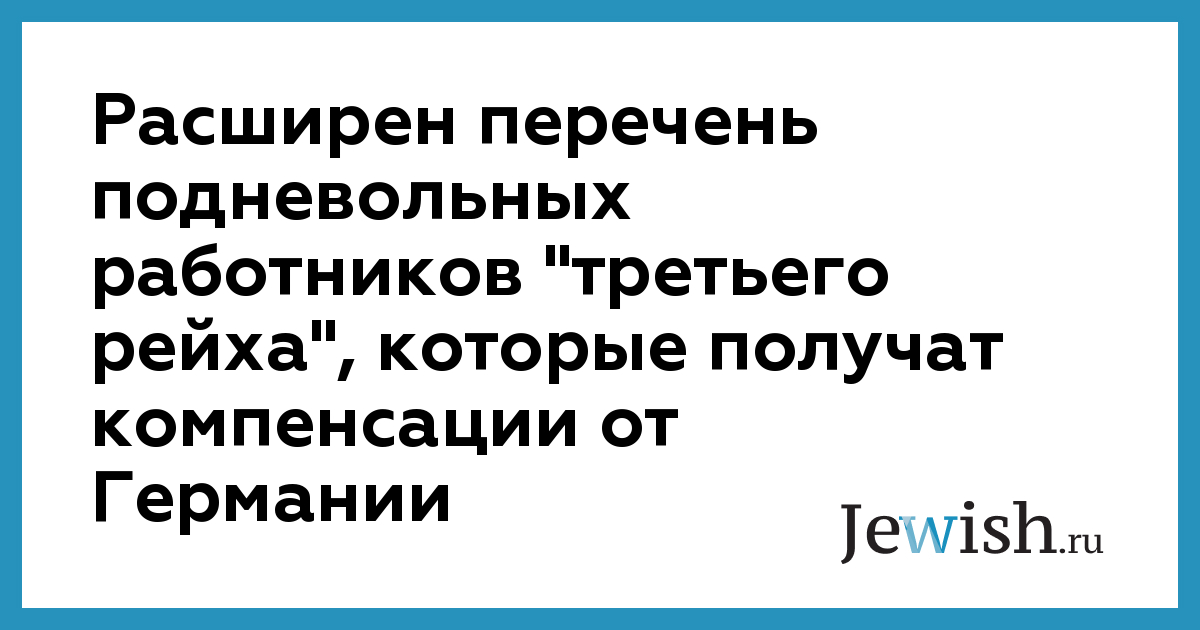Германия выплатит компенсации жертвам Катастрофы европейского еврейства, находившимся в таких местах, которые до сих пор не были включены в список мест заключения – трудовые лагеря в Румынии, Словакии, бывшей Югославии, Ливии и лагерь Сомобит в Болгарии. Соглашение о дополнительных компенсациях было достигнуто на прошлой неделе в ходе переговоров между Министерством финансов Германии и Комиссией по возвращению еврейского имущества, конфискованного во время второй мировой войны. Эта комиссия представляет интересы всех евреев, пострадавших в период Катастрофы. Каждый из оставшихся в живых начнет получать ежемесячное пособие в размере 500 немецких марок (250 евро или 1.000 шекелей). Пособие будет выплачиваться тем из пострадавших, которые имеют ежемесячный доход ниже 5.500 шекелей на одного человека или 7.300 шекелей на супружескую пару в возрасте до 70 лет, и 7.800 шекелей на одного человека или 10.600 шекелей на супружескую пару в возрасте старше 70 лет.