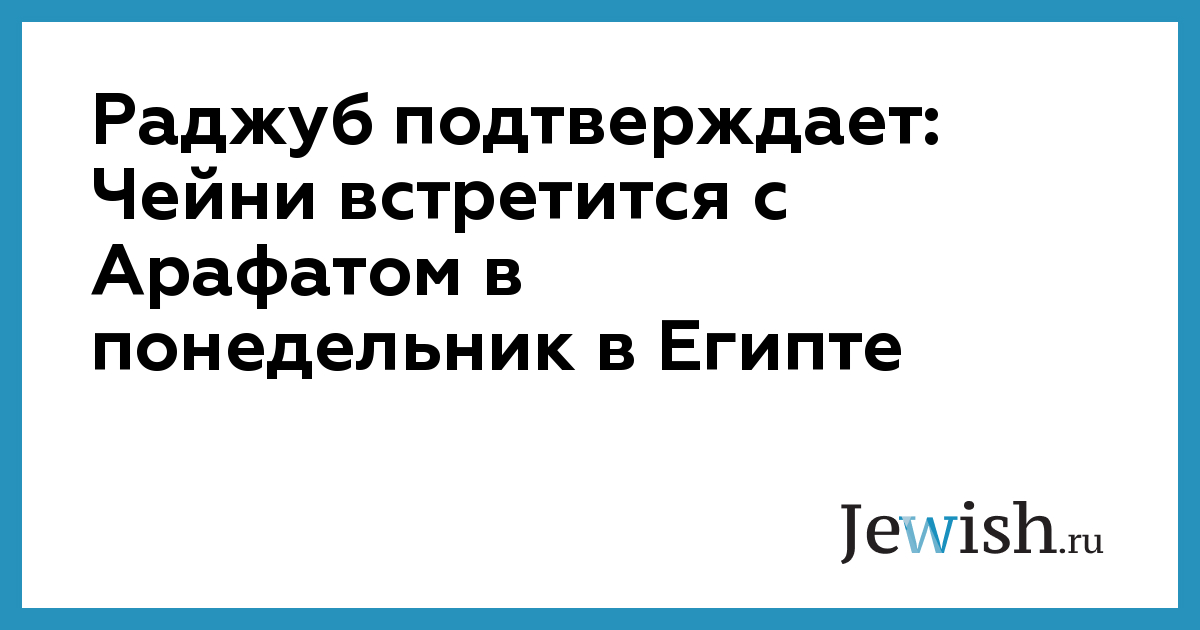 Руководитель палестинской службы безопасности на Западном берегу Иордана Джибриль ар-Раджуб подтведил, что в понедельник в Каире пройдет встреча главы Палестинской национальной администрации Ясира Арафата с вице-президентом США Ричардом Чейни. Местом встречи американского вице-президента и палестинского лидера может стать Каир или город-курорт на Красном море — Шарм эш-Шейх. По сообщению египетского агентства МЕНА, на встрече в понедельник Арафать и Чейни ситуацию в зоне палестино-израильского противостояния и "проведут поиск путей оживления мирного процесса". Джибриль ар-Раджуб также сообщил что после встречи с вице-президентом США Арафат встретится в Испании с премер-министром этой страны и действующим председателем Европейского союза Хосе Марией Аснаром, а в среду прибудет в Бейрут, где в этот день начнется арабский саммит.