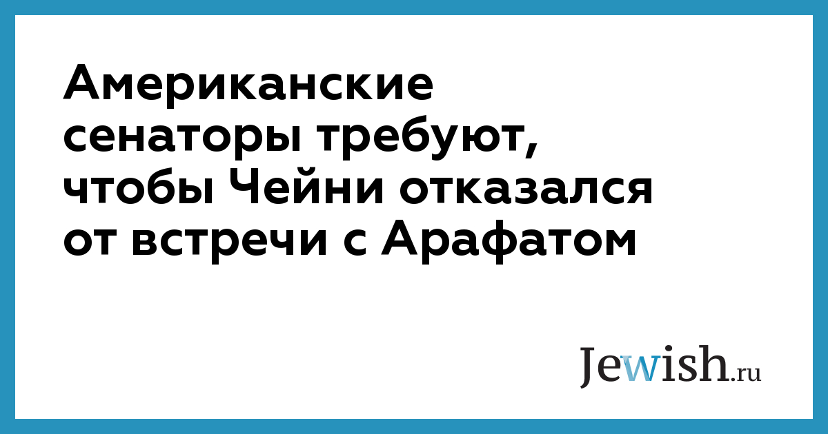 Свыше 50 американских сенаторов подписали обращение к президенту Бушу с требованием, чтобы вице-президент США Ричард Чейни отказался от встречи с Ясиром Арафатом. "До тех пор, пока Арафат и возглавляемая им администрация палестинской автономии не докажут на деле свою приверженность делу мира и не положат конец террору, мы настаиваем на том, чтобы вице-президент пересмотрел свое обещание провести переговоры с Арафатом", — говорится в обращении, подписанном 52 сенаторами. — "Признавая важность посреднической миссии генерала Зинни, мы надеемся на то, что он ясно покажет палестинцам, что США не станут иметь дела с теми, чьи действия расходятся с их заверениями". Ранее Чейни отложил на неопределенный срок встречу с Арафатом, назначенную на текущую неделю, поскольку палестинский лидер не сдержал обещание и не предпринял действенных мер для того, чтобы остановить насилие.