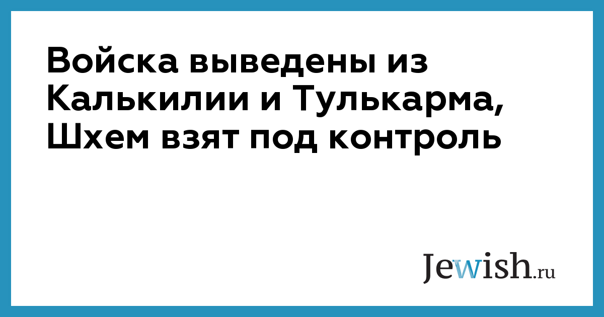 Израильские войска полностью выведены из палестинских городов Калькилия и Тулькарм на севере Западного берега реки Иордан. Вместе с тем, как и было запланировано израильским командованием, блокада обоих городов сохраняется. Как отмечается в официальном заявлении ВС Израиля, "израильские силы закончили свою миссию в Калькилии и Тулькарме и заняли новые позиции вокруг этих городов". Вывод войск состоялся после того, как президент США Джордж Буш вновь призвал Израиль "без промедления" завершить оккупацию палестинских территорий. Вместе с тем, несмотря на вывод войск из Калькилии и Тулькарма, ВС Израиля продолжают военные операции на палестинских территориях. Сегодня на рассвете израильские войска совершили рейд в палестинские населенные пункты Рафах (на юге сектора Газа) и заняли палестинское селение Дура на Западном берегу. Кроме того, после нескольких дней ожесточенных столкновений ВС Израиля удалось наконец взять под полный контроль город Шхем. Также продолжается оккупация Рамаллы, включая соседнее селение Аль-Бира, Бейт-Лехема, включая соседнее Бейт-Джала, и Дженина.