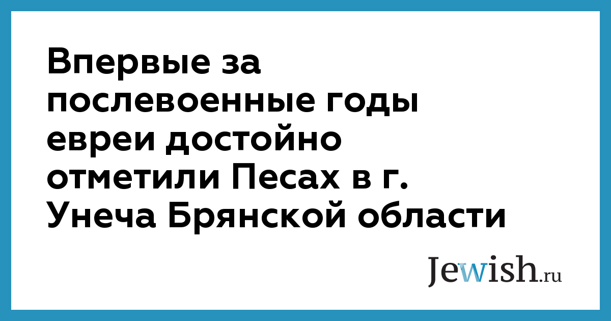 В этом году впервые за послевоенные годы Песах в г. Унеча отмечался по всем канонам иудейской религии. Это стало возможным благодаря помощи Федерации еврейских общин России и участию Брянской иудейской общины. Унеча – это небольшой город в Брянской области, с населением около 30 тысяч человек, в т.ч. евреев 300 человек. Руководство общины решило использовать возможность провести седеры с участием инструкторов из США и Австралии. ФЕОР одобрило инициативу общины, и для проведения седера прибыли двое молодых ребят – И. Фейгин из Австралии и И. Раппопорт из США. Ребята провели в городе 10 дней, за это время они успели провести 2 шабата, празднование 100-летия со дня рождения Любавичского Ребе, на которых присутствовали в общей сложности 90 человек, и 2 седера (125 человек). Праздник прошел с большим подъемом, при активном участии всех присутствующих. Успеху способствовало знание идиш, как инструкторами, так и присутствующими, и услуги переводчика почти не потребовались. Еврейская община осталась очень довольна праздниками, почувствовав сопричастность с еврейским народом, народом Израиля. На одном из шабатов присутствующие почтили минутой молчания память погибших в последних терактах в Израиле.
