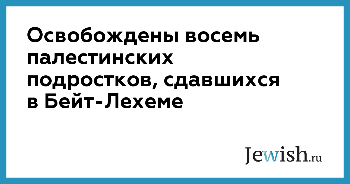 Восемь из девяти палестинских подростков, вышедших в четверг из церкви в Бейт-Лехеме и задержанных израильскими военными, были освобождены в пятницу. Один из арестованных по-прежнему находится у израильтян по подозрению в причастности к боевикам. По словам представителя израильского командования, у военных есть сведения, что арестованный занимался работой со взрывными устройствами на протяжении 19 месяцев с начала "интифады". 16-летнего Хамзу Эль-Хмура будут допрашивать, и в случае отсутствия весомых доказательств его причастности к террористам освободят. Напомним, в четверг в результате переговоров израильтяне позволили покинуть осажденную церковь 9 палестинцам в возрасте от 14 до 20 лет.