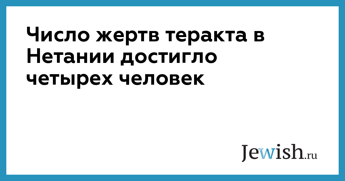Число жертв теракта в Нетании достигло четырех человек. Сразу после взрыва на рынке были обнаружены тела двух погибших. Один из них, как предполагают, был террористом-смертником. Позже еще двое израильтян скончались в больнице. Всего ранения получили около 40 человек, некоторые из них находятся в тяжелом состоянии.