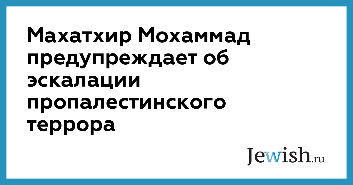 Премьер-министр Малайзии заявил, что в условиях продолжающейся эскалации палестино-израильского конфликта страны и организации, поддерживающие Израиль, могут стать мишенями для новых террористических атак. Махатхир Мохаммад, известный своими антисемитскими взглядами и выпадами против государства Израиль, заявил в четверг, 20 июня на ежегодном съезде своей партии, которая является правящей в стране, что политика Израиля по отношению к палестинцам "закономерно" привела их к террористической войне. "Мы опасаемся, что те, кто до сих пор осмеливаются поддерживать Израиль, могут стать целями для террористов, причем случиться это может где угодно, в любой стране и в любом городе мира", — заявил Махатхир. Придерживаясь умеренных мусульманских взглядов, Махатхир является стойким приверженцем палестинцев и их "интифады", но в своих публичных высказываниях он осудил теракты бомбистов-смертников, направленные на израильских мирных жителей.