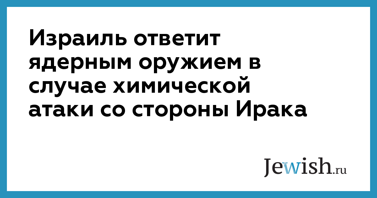 Если Ирак применит против Израиля какое-либо оружие массового поражения (а Саддам неоднократно намекал, что сделает это в случае американского вторжения), Израиль может нанести ядерный удар возмездия, который "уничтожит Ирак как государство". По сведениям Ha’aretz, эту информацию недавно предоставил Комитету по иностранным делам сената США Центр изучения стратегических и международных проблем. Доклад Центра основан как на данных разведки, так и на официальных документах администрации США. CNN напоминает, что еще в 1991 году, во время войны в Заливе Ричард Чейни (тогда министр обороны, а теперь вице-президент) предупредил, что Израиль ответит ядерным оружием в случае химической атаки со стороны Ирака. За прошедшие годы ситуация стала только серьезней, поскольку Ирак теперь, судя по всему, обладает не только химическим, но и биологическим оружием, — пишет Ha’aretz. Доклад анализирует возможные сценарии израильского ответа. Ни один сценарий не допускает возможности, что Израиль первым нанесет превентивный ядерный удар.