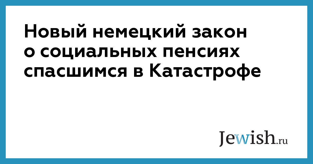 20 июня 2002 года немецкий парламент принял закон о социальных пенсиях для спасшихся в Катастрофе. В большинстве случаев закон предусматривает ретроактивные выплаты с 1 июля 1997 года. Под действие этого закона подпадают те: кто находился в годы войны в гетто на территории, окупированной нацистами или присоединённой ими к третьему рейху, признаны преследуемыми нацистами по немецкому закону о выплате компенсаций, выполняли какие-то работы добровольно и получали за них какое-то вознаграждение и не получают социальной пенсии какого-либо другого государства за период пребывания в гетто. Как нам сообщили из Центра информации, в немецких документах правило «добровольной работы» сформулировано очень расплывчато и по нему ожидаются дальнейшие разъяснения, а также, возможно, будет дан список гетто, чьи узники подпадают под действие нового закона. Те, кто отвечают всем вышеперечисленным условиям, а также вдова/вдовец такого человека могут подать просьбу о получении социальной пенсии из Германии через отдел по международным соглашениям Битуах Леуми по адресу: проспект Вайцман, 13, Иерусалим, 91909, факс: 02/6512683. Битуах Леуми пересылает заполненные бланки просьбы в Германию. Бланк следует подавать до 30 июня 2003 года. Тот, кто затрудняется самостоятельно заполнить бланк может получить бесплатную помощь в этом в отделениях Битуах Леуми по следующим адресам: Тель-Авив, проспект Масарик, 15, воскресенье, вторник и четверг, с 8:00 до 13:00, Иерусалим, ул. Бен Шетах, 4, в те же дни и часы. Разъяснения по телефону можно получить по номеру: 02/6463077, воскресенье, вторник, четверг, с 9:00 до 12:00.