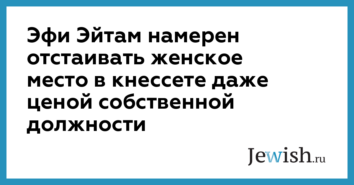 Все члены кнессета от этой фракции согласились с решением о резервировании одного места за представительницей слабого пола. Когда же до Эйтама дошли слухи, что в ЦК создается оппозиция по этому вопросу, он очень решительно дал понять, что, скорее уйдет с поста лидера партии, чем поступится своими принципами.