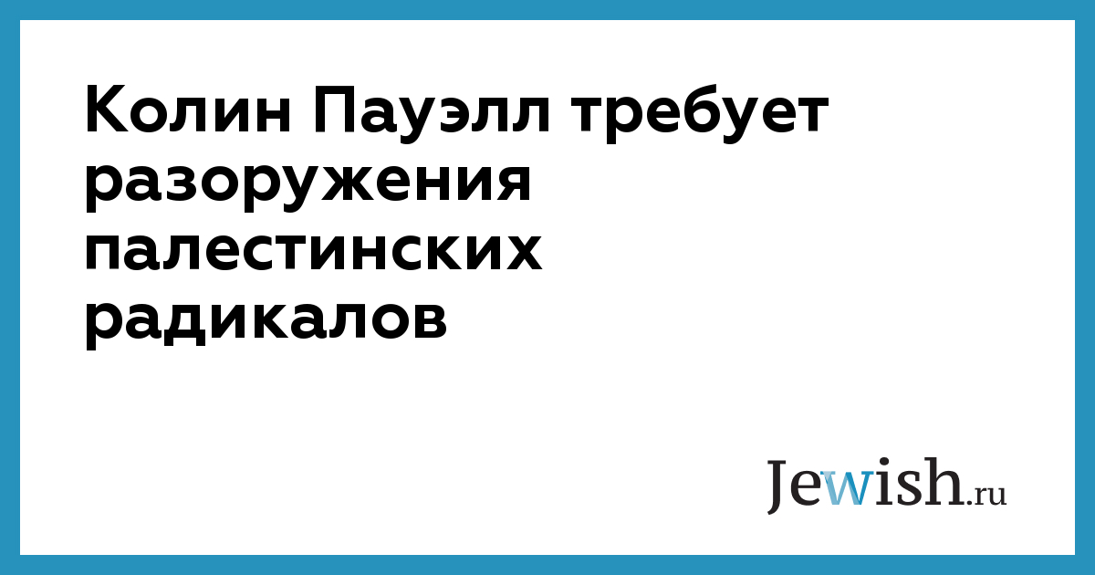 "В вашем будущем государстве не должно быть ни вооруженных людей, ни вооруженных формирований", — заявил Пауэлл, обращаясь к палестинцам в эфире телеканала "Эй-Би-Си". "Если будет создано палестинское государство, то все вооружение должно находиться под контролем правительства", — добавил глава американской дипломатии.