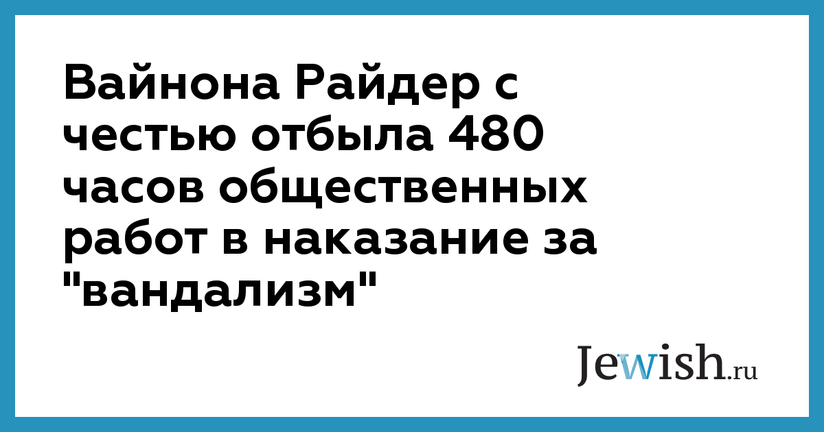 Судья, объявивший об окончании срока общественных работ для Вайноны, признал, что актриса «заслужила похвалу» от сотрудников социальных служб. 32-летняя Вайнона зарделась и поблагодарила судью. Как известно, в декабре прошлого года после суда Вайнона должна была отработать 480 часов на общественных работах, а также пройти курс психологических консультаций. Всего ее испытательный срок составит 3 года.