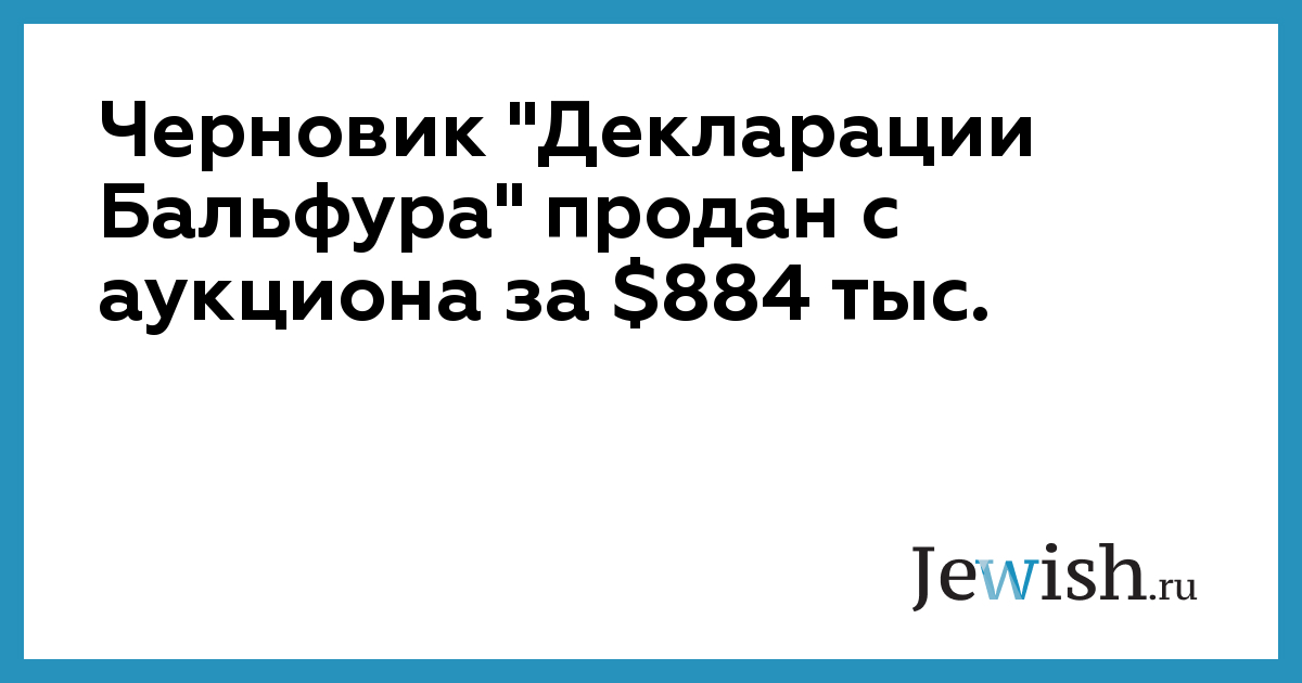 На аукционе Sotheby's черновик Декларации Бальфура продан за $884 тыс. В декларации указывается на поддержку Великобритании в создании еврейского государства в Палестине.