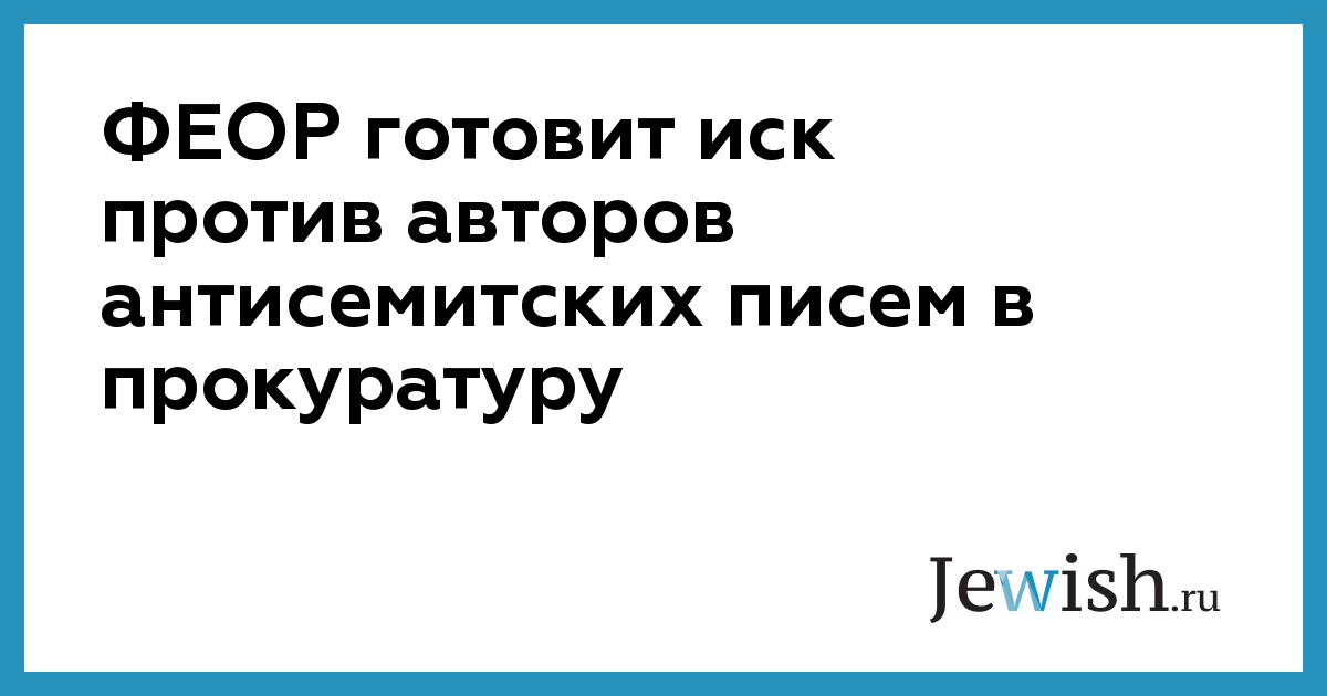 Федерация еврейских общин России (ФЕОР) готовит судебный иск против авторов антисемитских писем в Генпрокуратуру России. «Сейчас мы готовим серьезный иск против общественных деятелей, выступивших с антисемитскими заявлениями и опубликовавшими их в СМИ. Мы хотим более фундаментально подойти к этому вопросу», — заявил во вторник на пресс-конференции в Москве исполнительный директор ФЕОР Валерий Энгель.