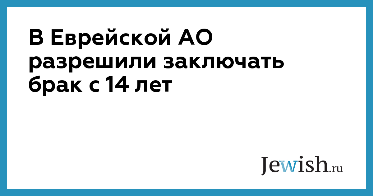 В еврейской автономной области принят закон "О порядке и условиях выдачи разрешения на вступление в брак лиц, не достигших возраста шестнадцати лет". Как сообщили в среду в законодательном собрании ЕАО, закон разработан на основе семейного кодекса РФ. Лицам от 14 до 16 лет на территории ЕАО может быть разрешено вступать в брак только при наличии особых обстоятельств.