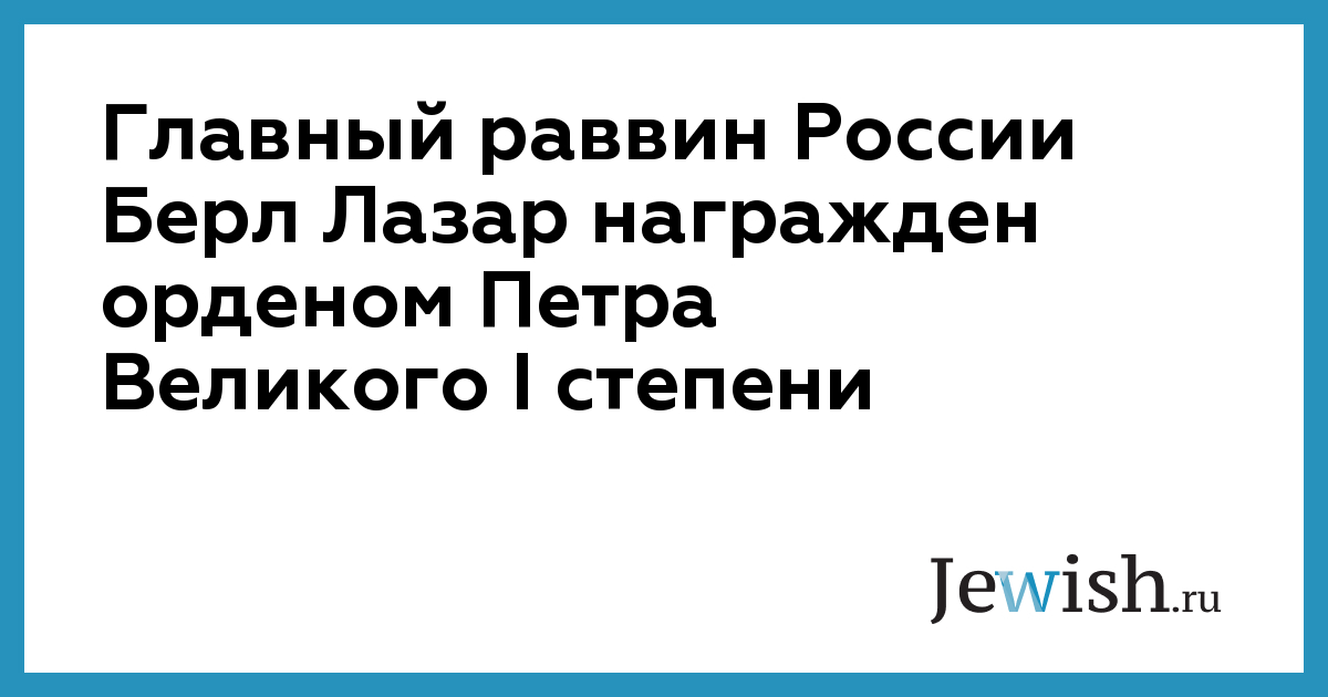 Сегодня в Московском еврейском общинном центре состоялась церемония награждения главного раввина России Берла Лазара орденом Петра Великого I степени. Как говорится в сопроводительной грамоте, раввин Лазар награжден «за развитие межнациональных связей и межконфессиональных отношений, огромный вклад в дело духовного возрождения еврейской общины России и укрепление государства Российского».