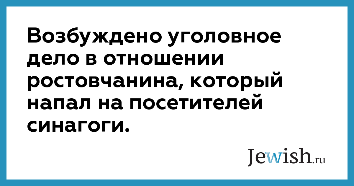 В Ростове-на Дону возбуждено уголовное дело в отношении 18-летнего ростовчанина, который напал на посетителей синагоги. Его обвиняют в хулиганстве, сейчас он находится под арестом. Накануне молодой человек явился в синагогу в нетрезвом виде и потребовал встречи с раввином, при этом размахивал разбитой бутылкой и угрожал посетителям.