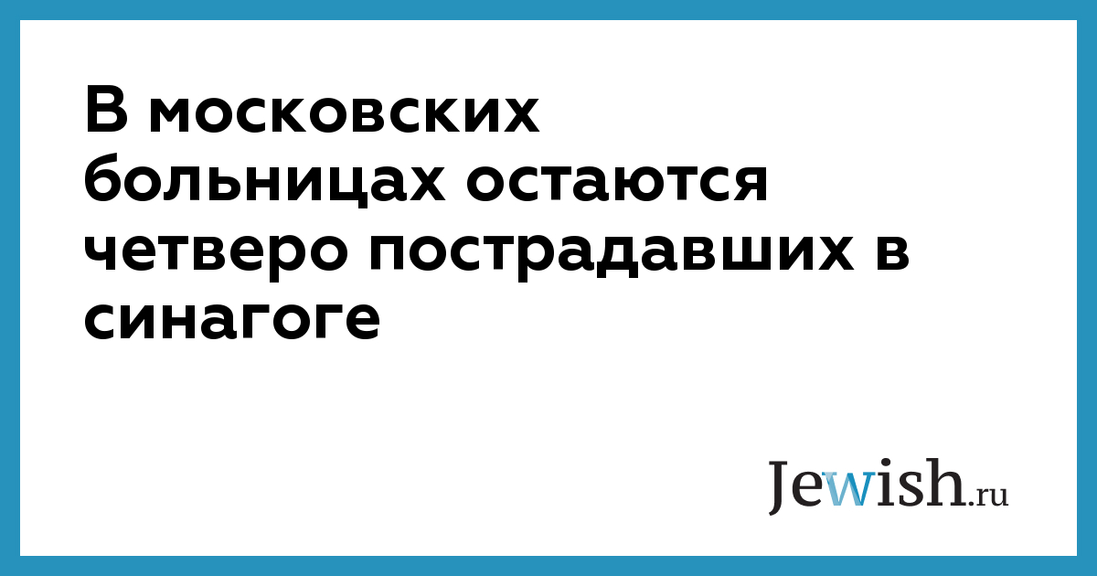 В московских больницах остаются четверо пострадавших в синагоге на Большой Бронной, сообщили РИА представитель столичного департамента здравоохранения. Все пострадавшие в состоянии средней тяжести. Напомним, в минувшую среду в помещение синагоги ворвался вооружённый человек и ранил ножом восьмерых прихожан.