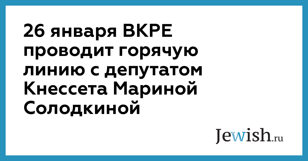 26 января 2006 года с 11 до 13:00 часов по московскому времени Иерусалимское отделение Всемирного конгресса русскоязычного еврейства проводит горячую линию с депутатом Кнессета, замминистра абсорбции, членом общественного совета ВКРЕ Мариной Солодкиной. Так же на ваши вопросы ответят представитель Министерства здравоохранения Израиля, старший врач больницы LТель Ха Шомер│ Геннадий Битман и русскоязычный адвокат Михаил Рони. Консультация предназначена для членов еврейских общин стран бывшего СССР и проводится по широкому кругу правовых и социально-правовых вопросов, социальной адаптации русскоязычных граждан Израиля.