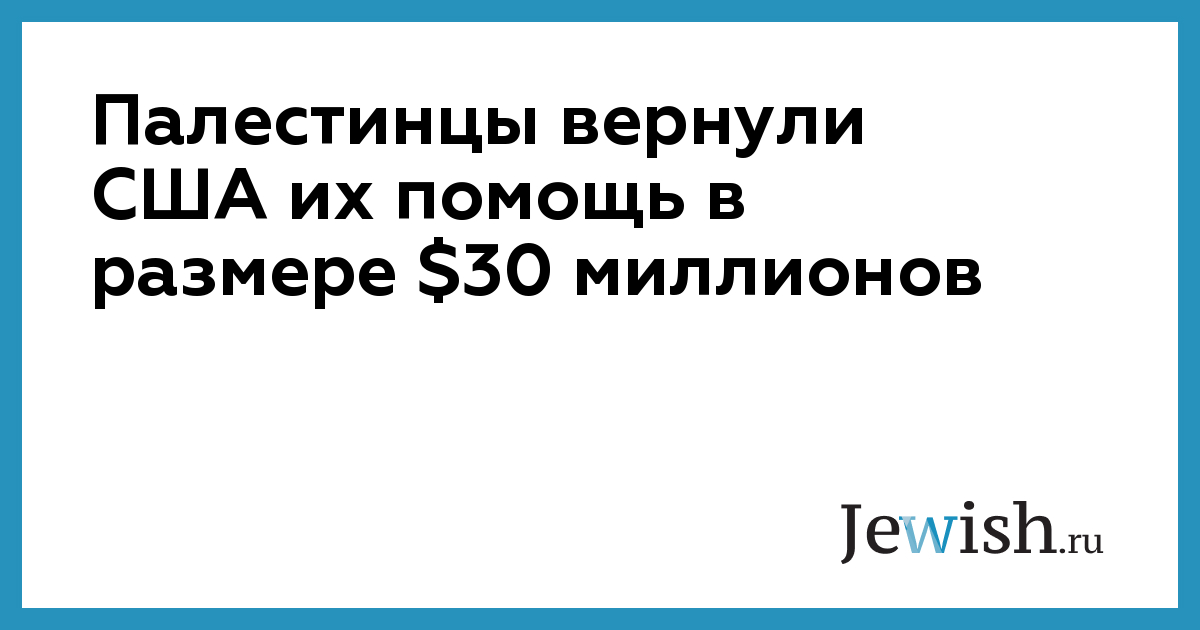 Палестинцы вернули США их помощь в размере $30 миллионов, сообщает в четверг агентство Рейтер со ссылкой на заместителя госсекретаря США по странам Ближнего Востока Дэвида Уэлша.