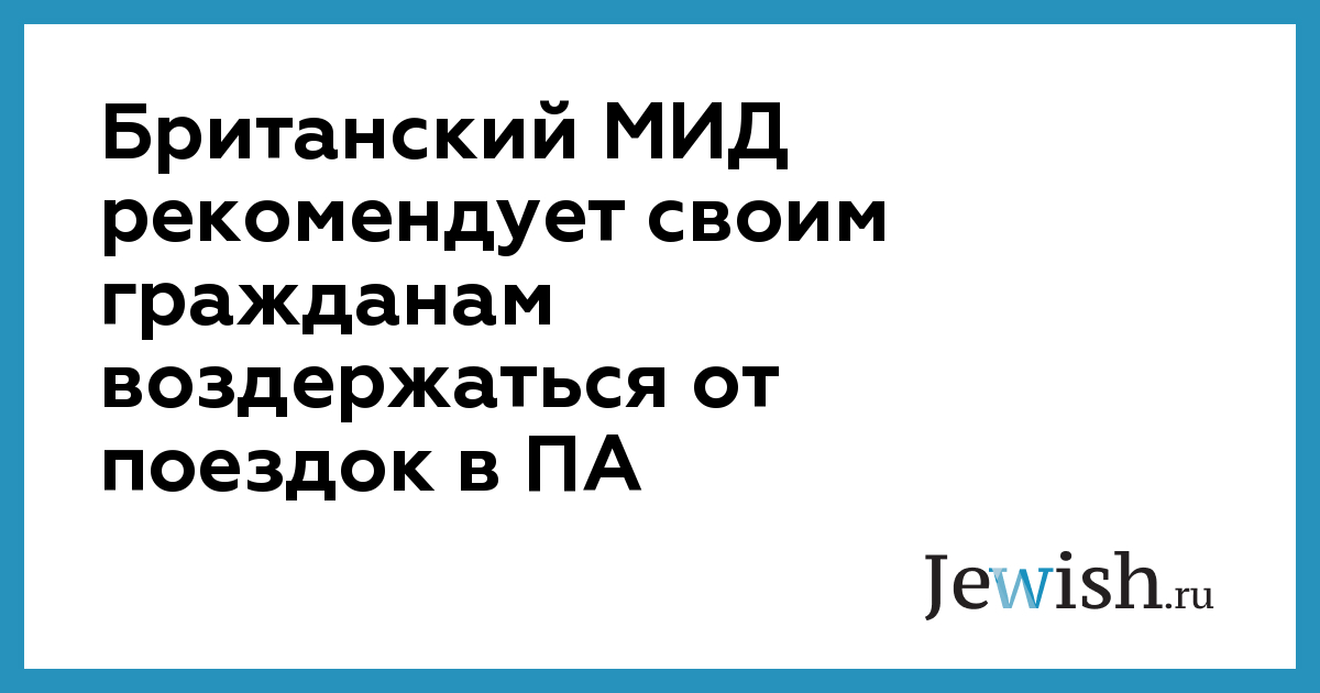 МИД Великобритании рекомендует своим гражданам воздержаться от поездок на палестинские территории, сообщает агентство France Press. Дипломаты считают, что британцам, а также американцам, опасно находиться в Палестине ввиду событий вокруг штурма израильскими военными тюрьмы в Иерхионе и захвата палестинцами представительства ЕС в Газе.