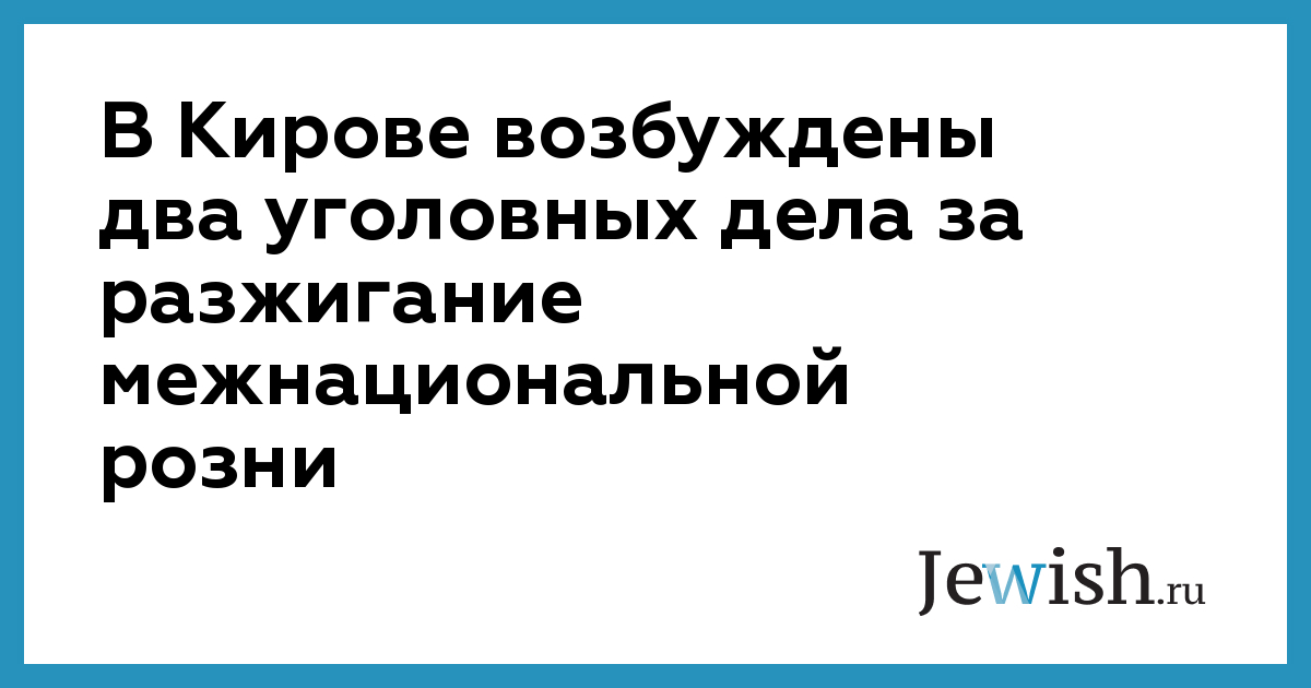 Там добавили, что аналогичное уголовное дело возбуждено прокуратурой Первомайского района города в отношении местного жителя. Его обвиняют в распространении в Кирове печатных изданий (брошюр), подрывающих доверие и уважение к евреям и их религиозному вероисповеданию, а также вызывающих неприязнь и чувство ненависти к образу жизни, культуре, религиозным обрядам людей этой национальности.